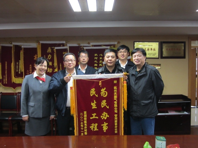 11月24日上午,杭州西湖街道和龍井村村委會一行,為公司送來了一面“為民辦事、民生工程”的錦旗,感謝公司為村里解決了困擾多年的用氣難題。